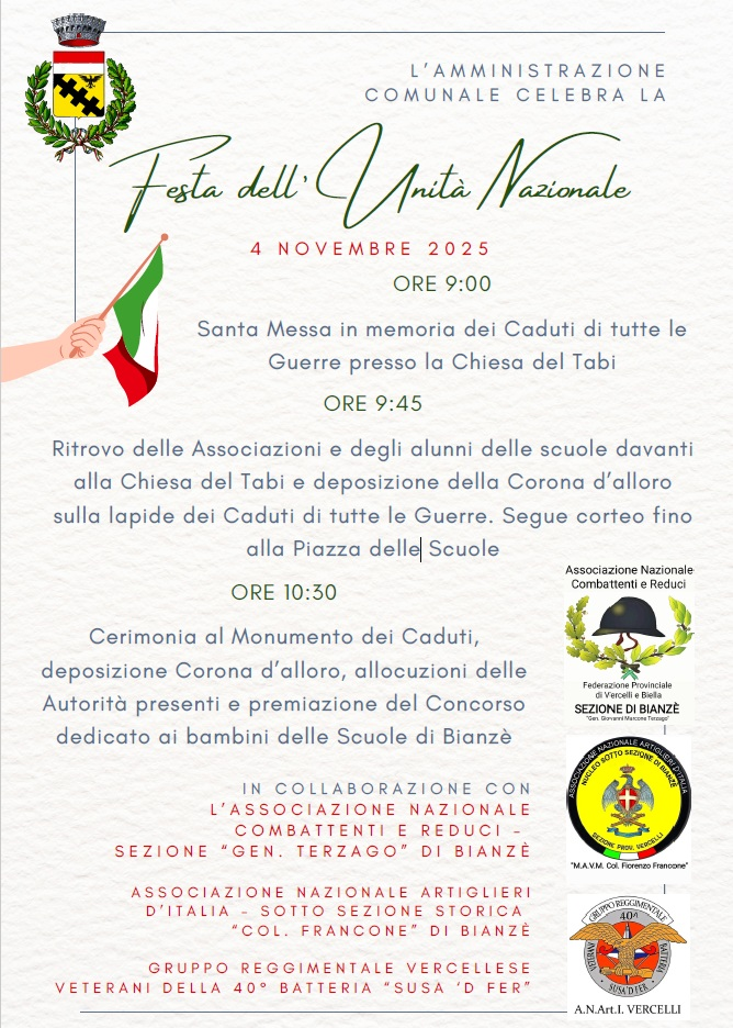 Martedì 4 Novembre 2025 l'Amministrazione Comunale celebra la Festa dell'Unità Nazionale