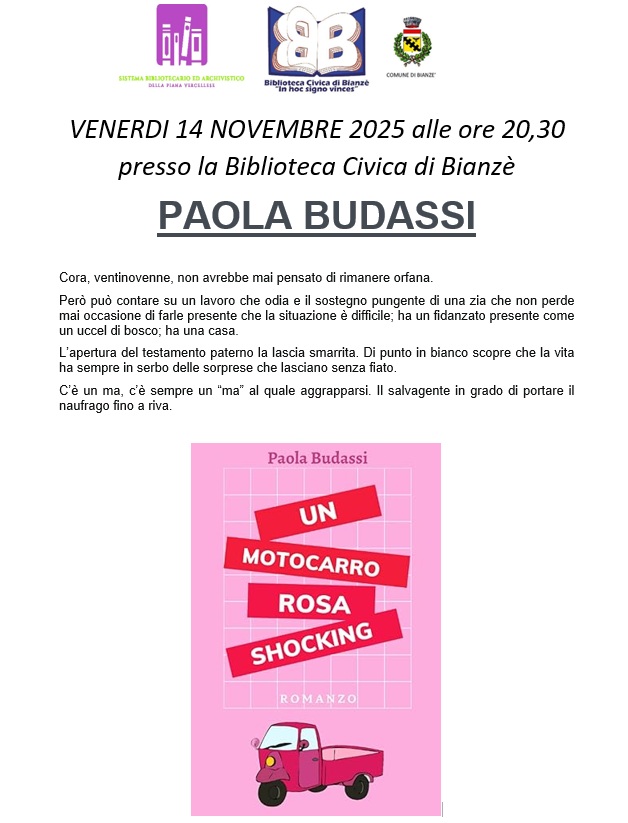 Venerdì 14 Novembre alle ore 20:30, presso la Biblioteca Civica di Bianzè, l'autrice Paola Budassi presenterà il suo nuovo romanzo.